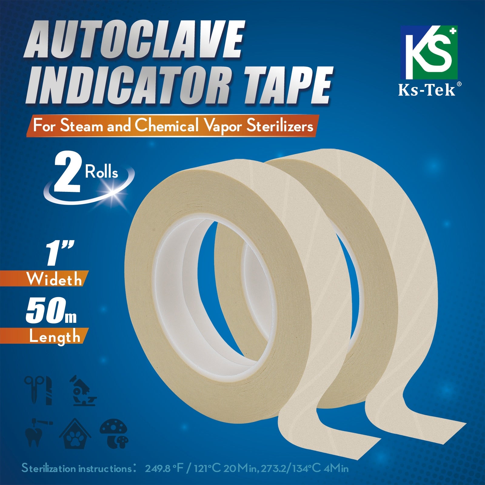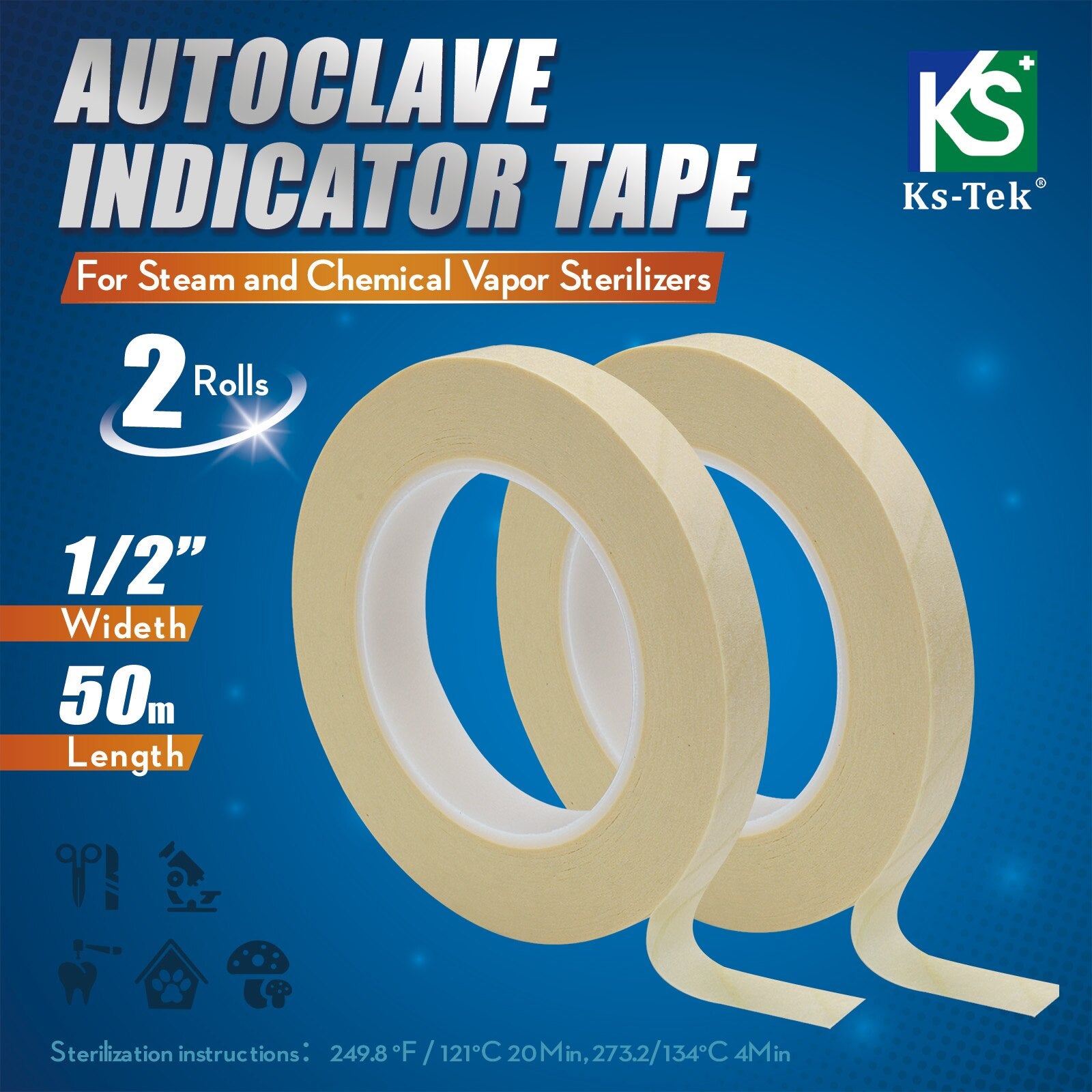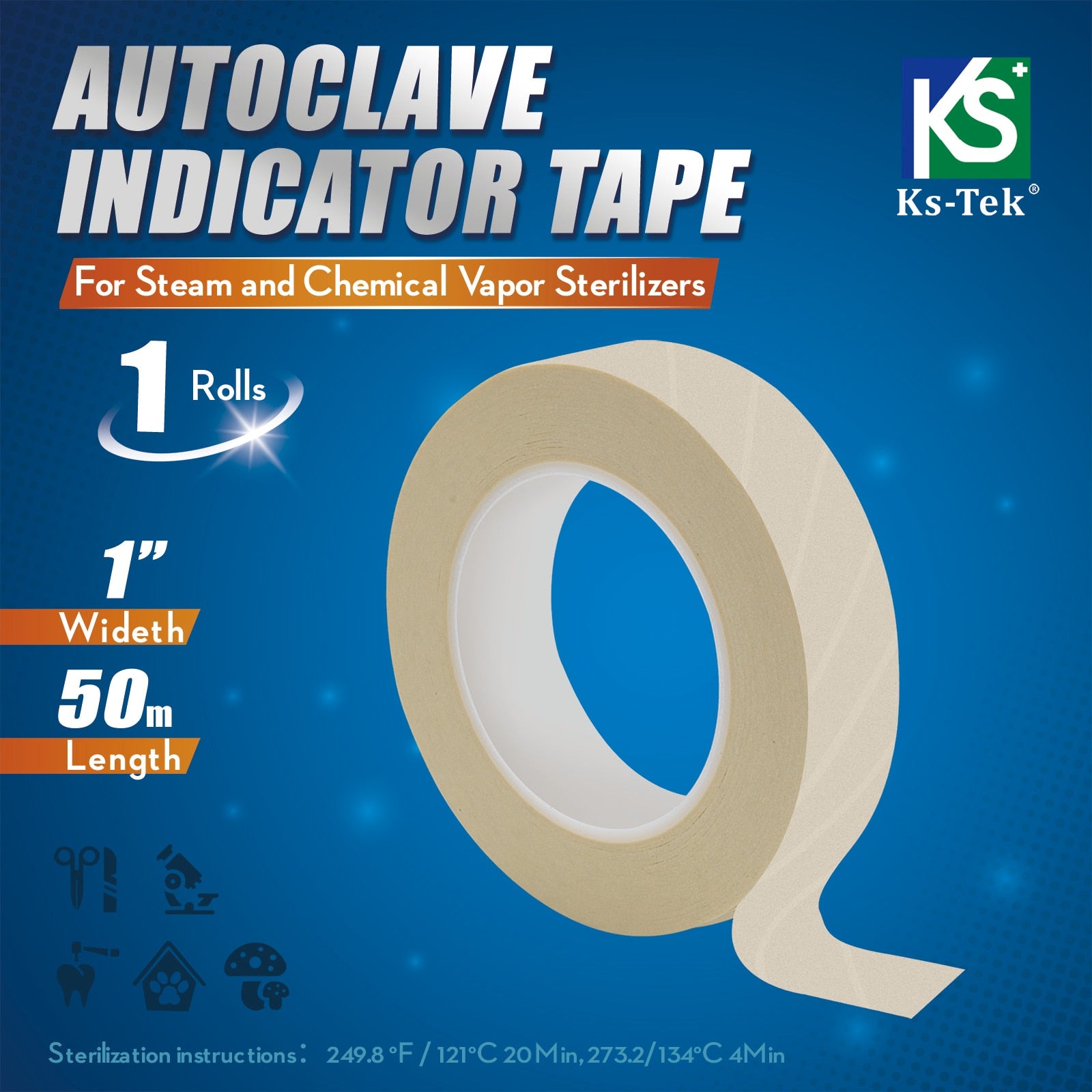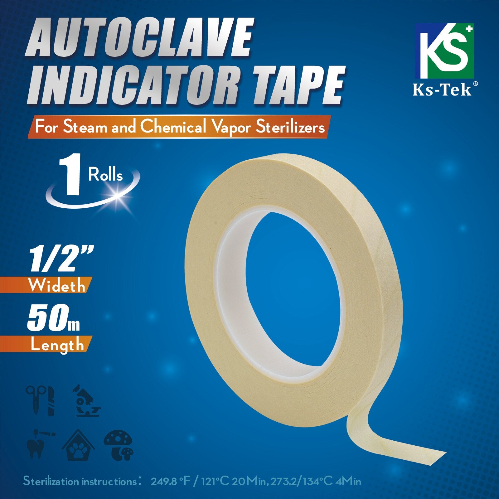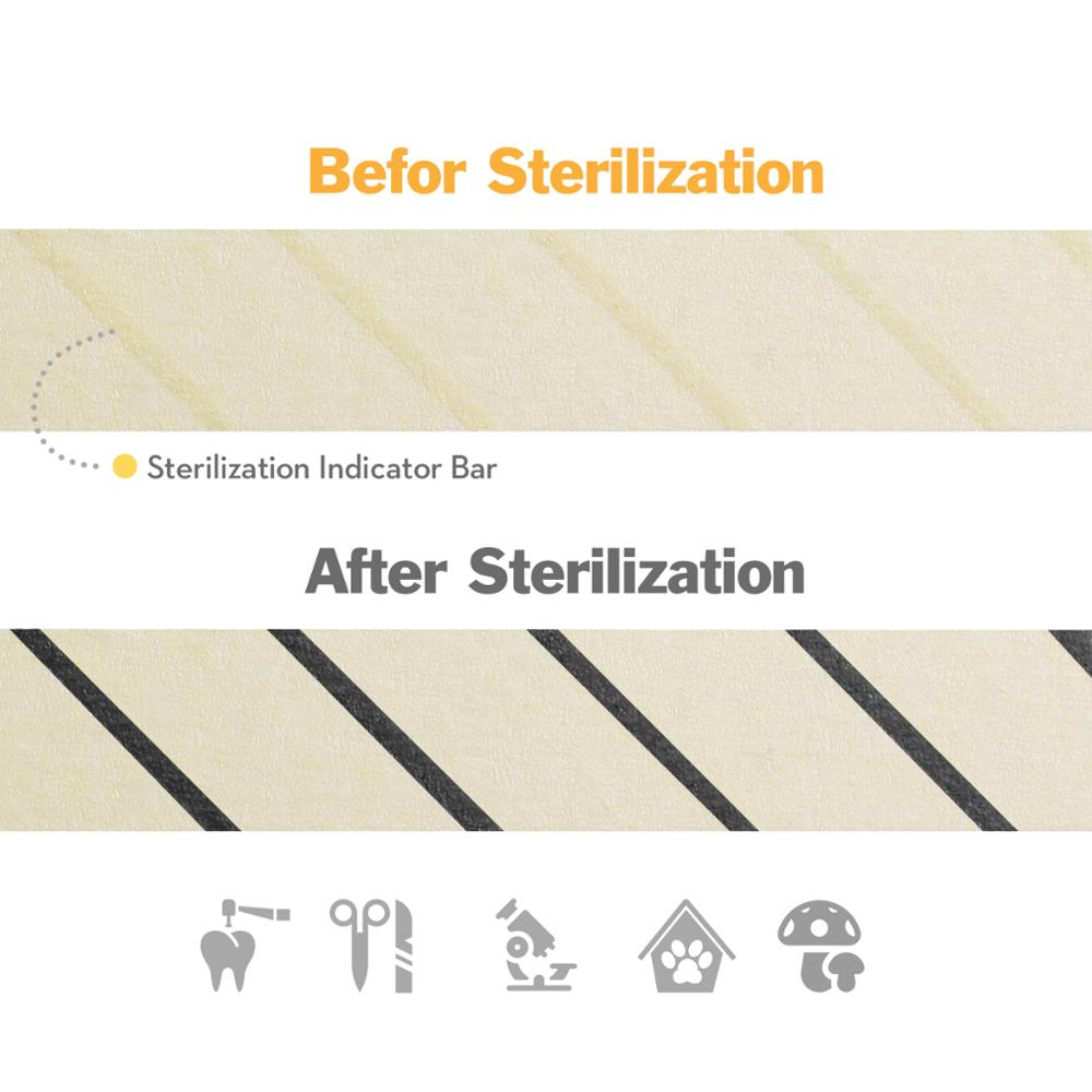 there is an irregular intermittent indicator on the indicator tape, 20 minutes in the exhaust sterilizer at 121 degrees Celsius or 4-6 minutes in the pre-vacuum pressure steam sterilization at-degrees Celsius, observe that the color strip on the tape changes from yellow to black, indicating that the sterilization process is completed. The unique design makes the indicator tape not fall off by itself due to high-pressure steam, leaving no residual glue, so that the package is clean and clean, and the ballpoint pen can be used to make relevant records on the tape, such as: validity period, the contents of the bag, the person in charge, etc. It can be used to seal the package to ensure that the sterilized package is neither tight nor delivered, which is conducive to the smooth penetration of steam and easy to manage.