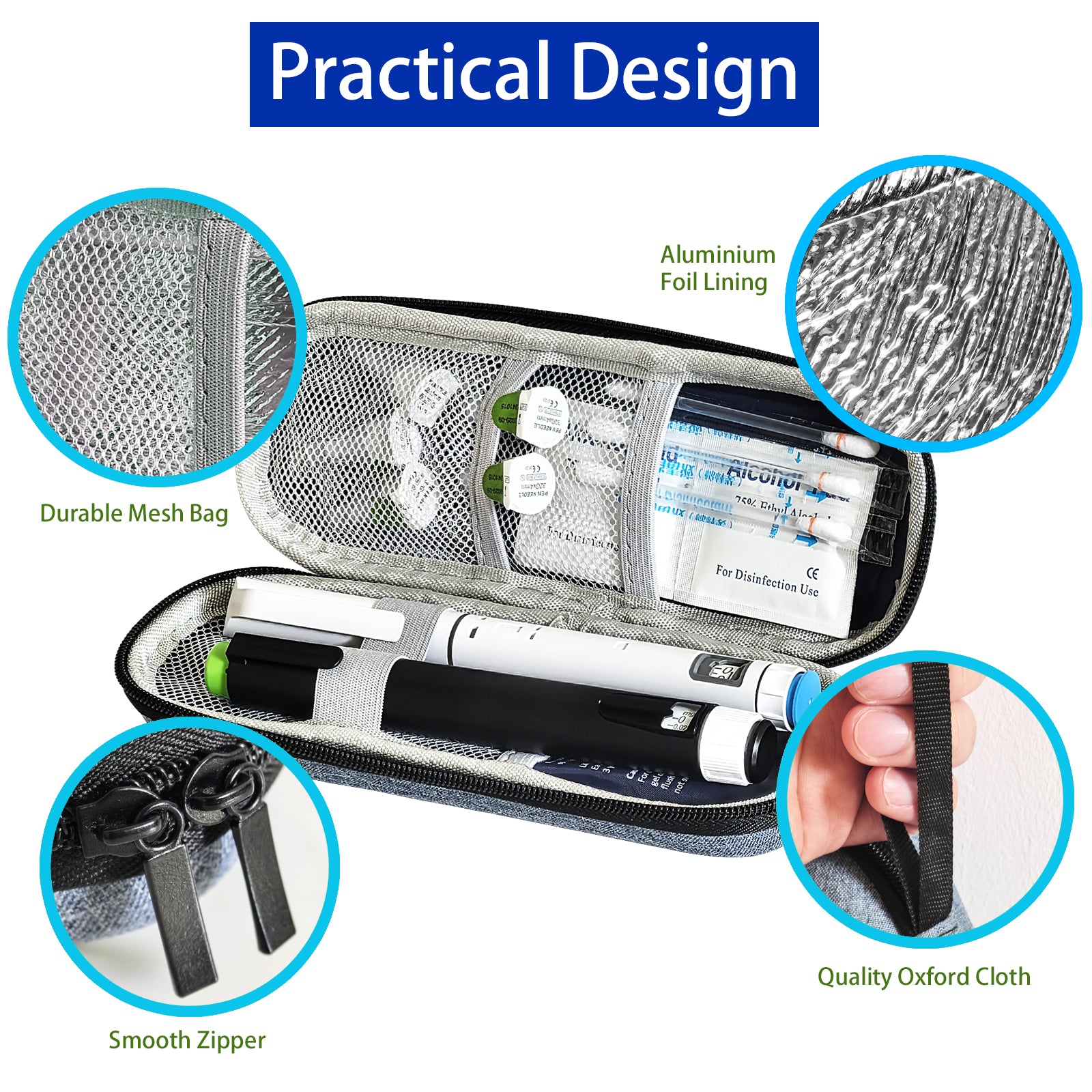 Compact & Organized Design: Measuring 7.2 x8x 2 inches , the bag is portable and features two internal pockets with elastic mesh straps to secure insulin pens, needles, and accessories neatly in place