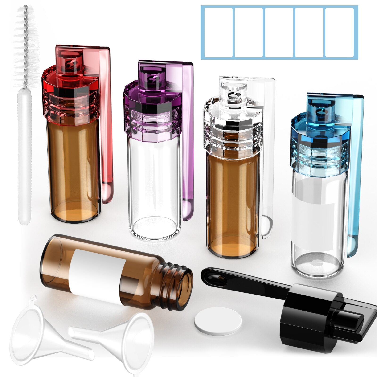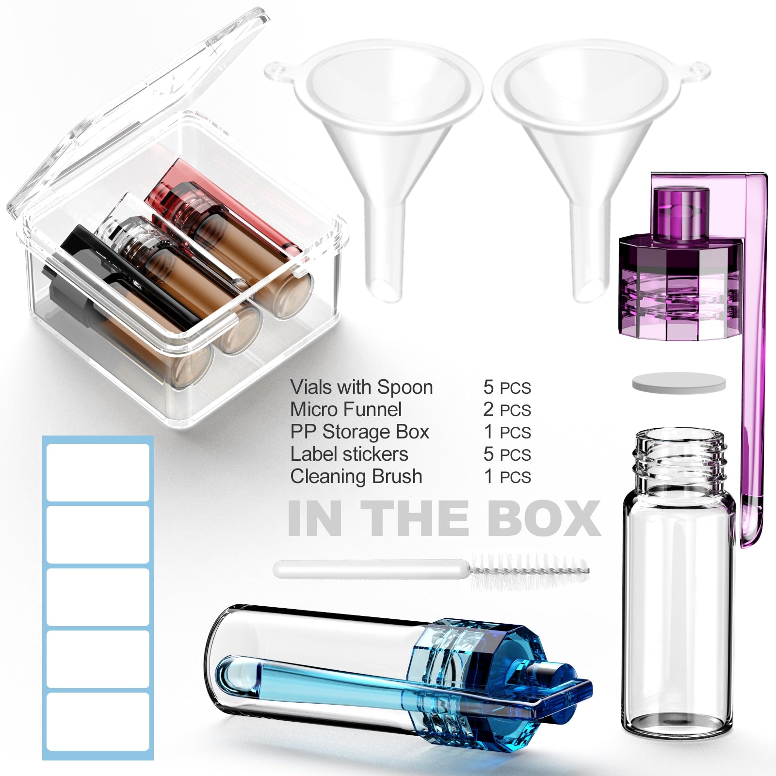 Ks-Tek Glass Vial with Spoon,(5 PCS) Leak-Proof Small Storage Bottle for Outdoor Camping Travel,with Micro Funnel & Stickers