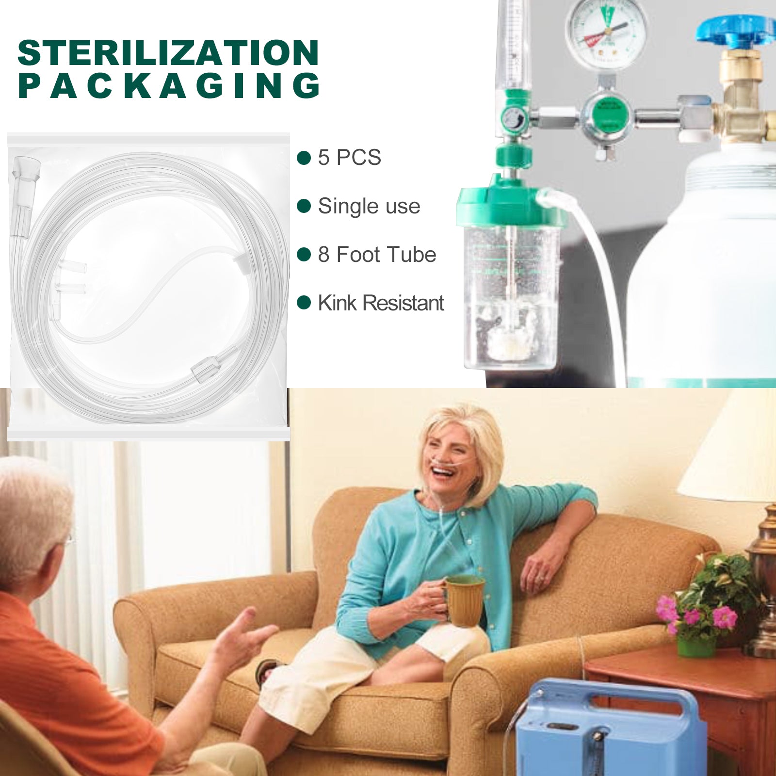 4.Sterilization Packaging ,Each nasal cannula is Sterilized packaged, guaranteeing cleanliness and hygiene prior to use.The 8-foot lightweight tubing ensures convenience and portability.