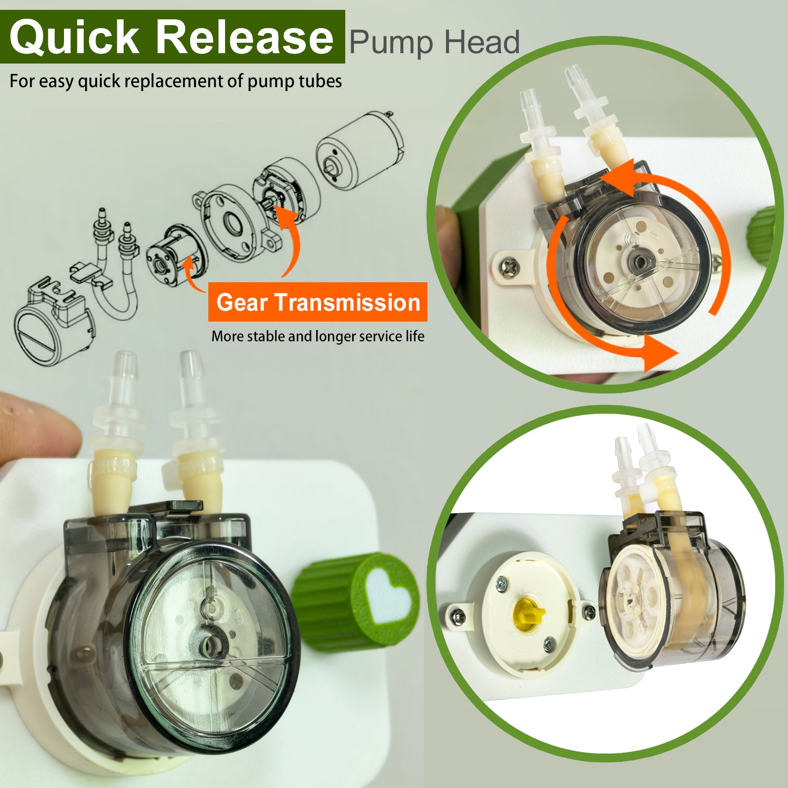 Liquid transferfor with transparent and quick release pump head for easy observation tube changes and easily release removable
